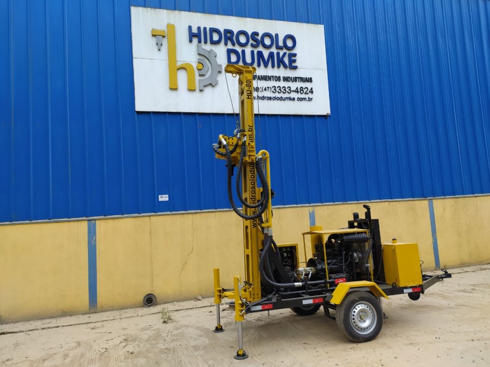 A) Sonda Roto-Pneumática, marca HIDROSOLO/DUMKE, modelo HD-80, nova, totalmente hidráulica, fabricação 100% em nossas instalações, sobre reboque mono eixo com componentes dispostos sobre estruturas de laminados de aço, painel de comando lateral, tanque de óleo hidráulico em aço carbono, nivelamento por Três sapatas hidráulicas, com as seguintes características: