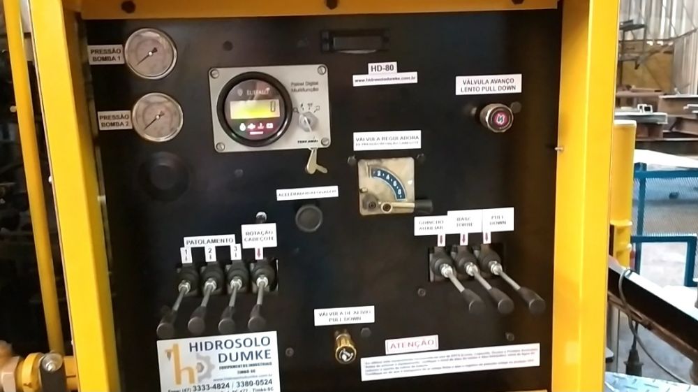 * Painel de comando com registro de pressão para avanço lento, regulador de velocidade de rotação do cabeçote, válvula de alívio do Pull Down/Pull Back, horímetro, e comandos hidráulicos de acordo com quantidade a seguir: 3 comandos individuais para patolamento (Sapatas de nivelamento), 1 comando para rotação do cabeçote, 1 para o Pull Down (sobe e desce), 1 para articulação da torre e demais itens necessários como relógios analógicos para controle de vazão e pressão e painel com instrumentos digitais do motor diesel.