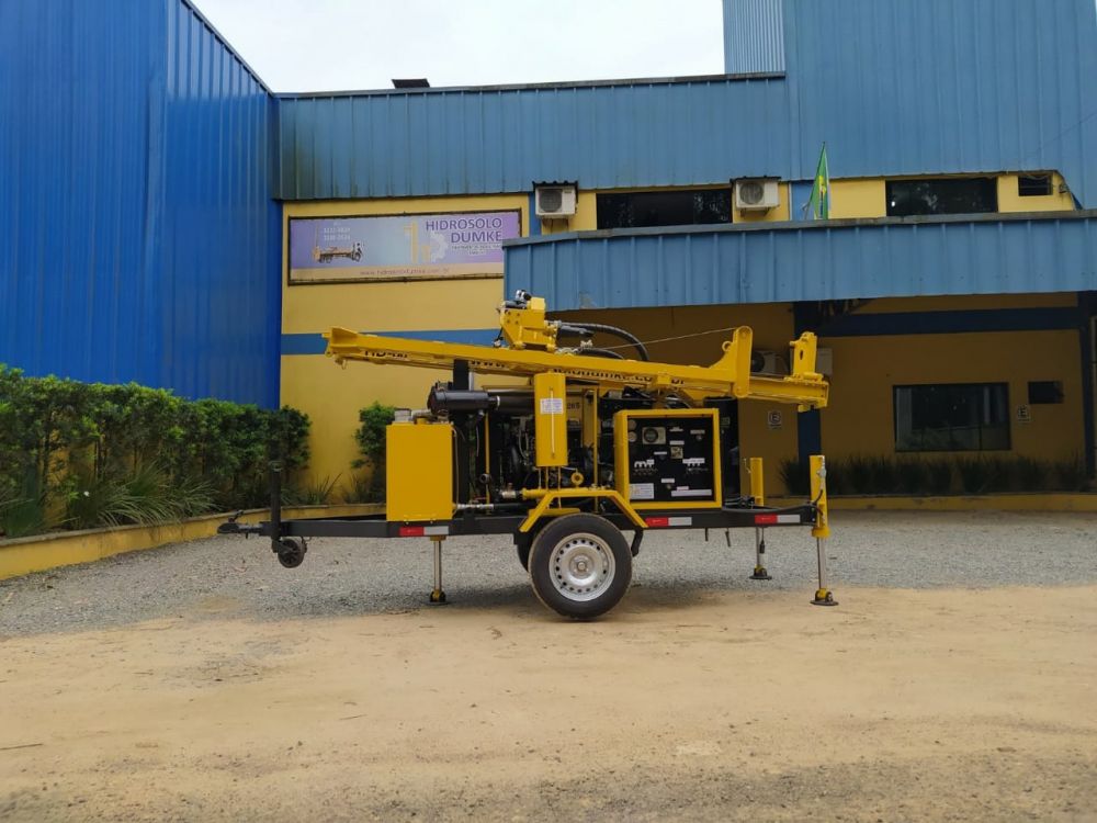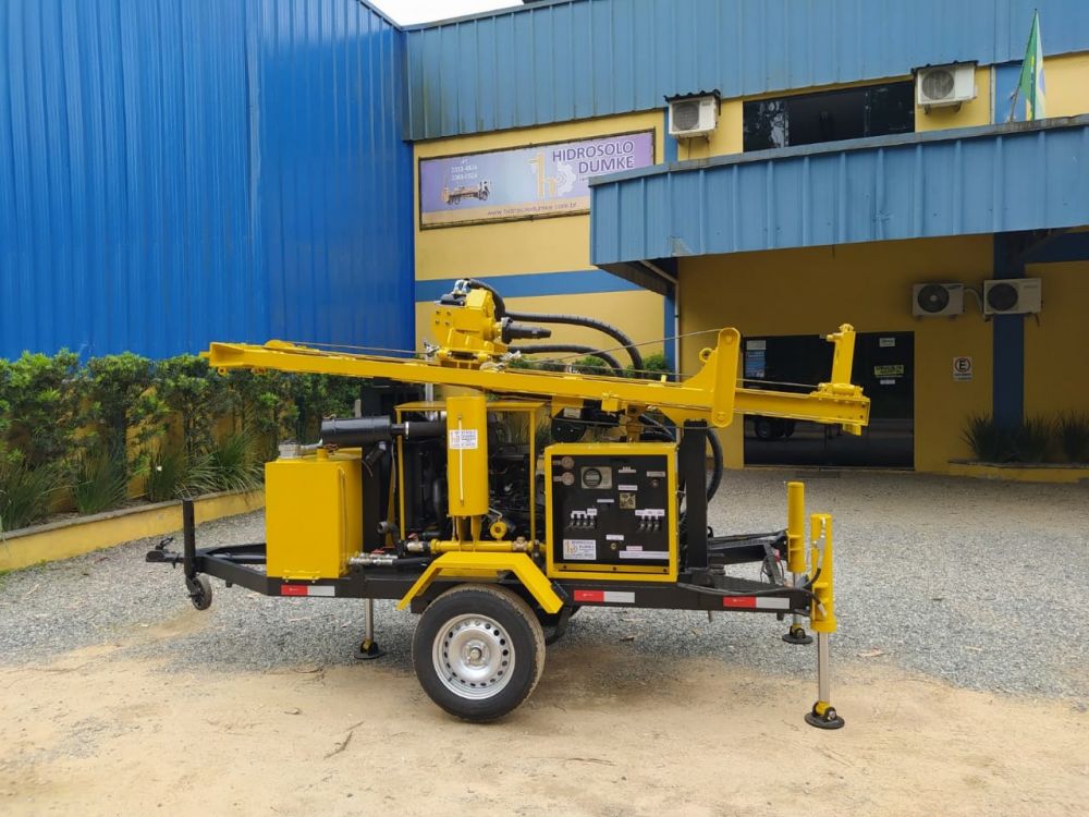 Sonda Roto-Pneumática, marca HIDROSOLO/DUMKE, modelo HD-80 PLUS, nova, totalmente hidráulica, fabricação 100% em nossas instalações, sobre reboque mono eixo com componentes dispostos sobre estruturas de laminados de aço, painel de comando lateral, tanque de óleo hidráulico, em aço carbono, nivelamento por Três Sapatas hidráulicas, com as seguintes características: