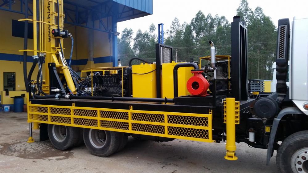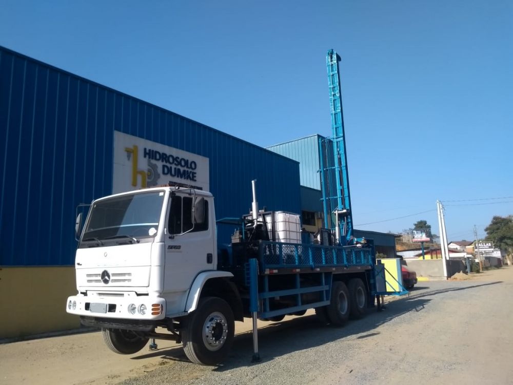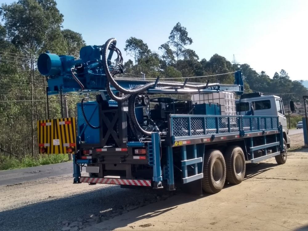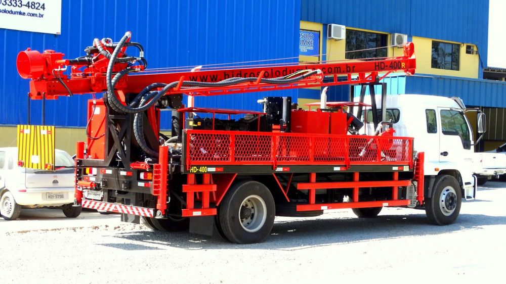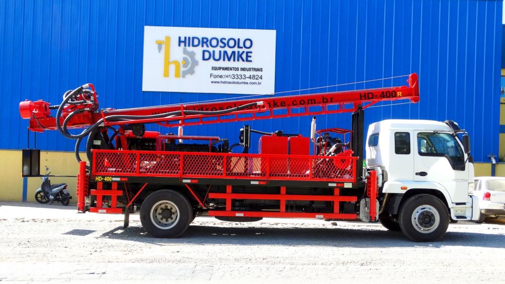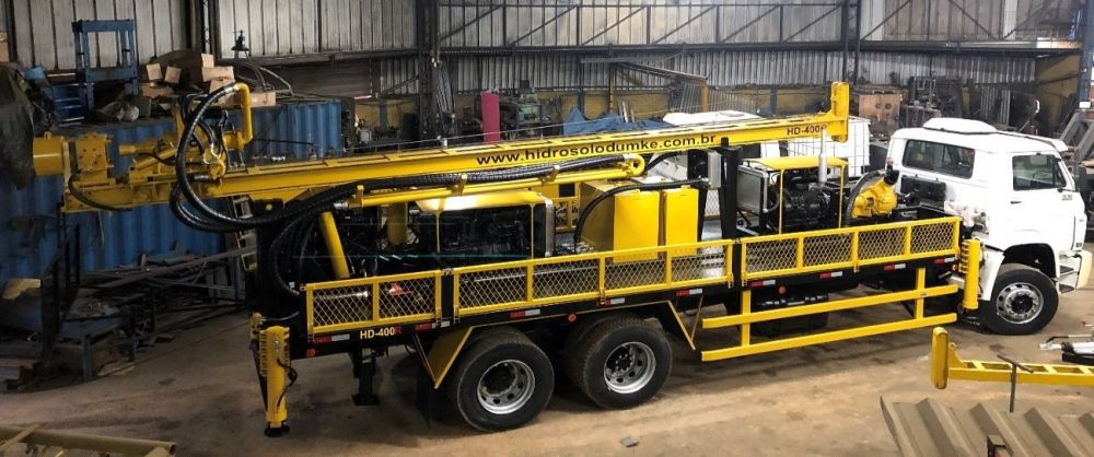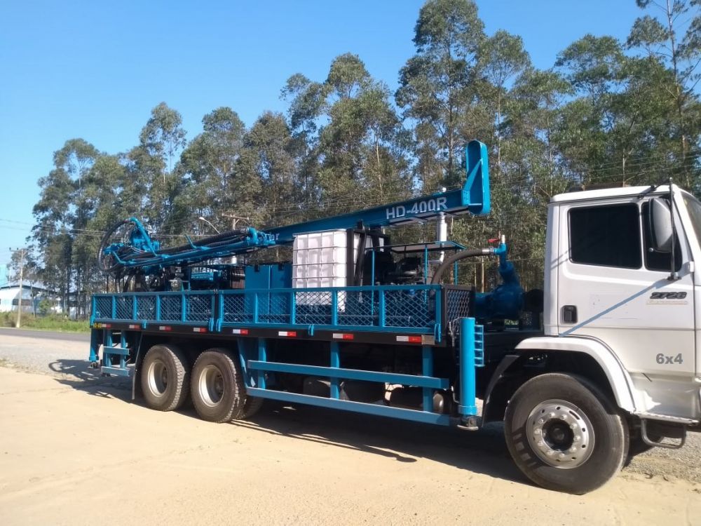 Sonda ROTATÍVA, modelo HD-400R totalmente hidráulica, para montagem sobre caminhão com capacidade de perfuração até 400m em 12” no sistema Rotativo com circulação de lama ou 600m em 6” no sistema Roto-Pneumático com ar comprimido de alta pressão.