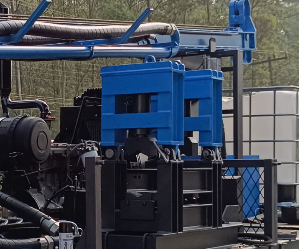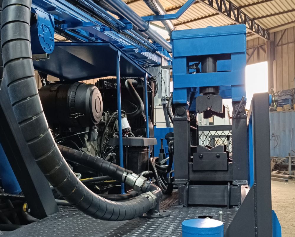 . Novidade agora o Desmontador de Martelo e Bits, trata-se de um mecanismo com acionamento hidraulico com 2 pistões e 4 mordentes que prende o martelo e 1 pistão hidraulco que aciona a articulação da chave para soltar o Bits de perfuração